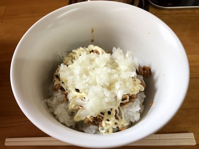 こちらは、一緒にいただいた品。肉味噌の上にマヨネーズがかかり、更に生の刻みタマネギが乗っているという構成で、それらが合わさると、私の貧弱なボキャブラリーだと「面白い風味」となってしまうのですが、食が進む味であるのは間違いないところ。そんな中、いい意味でマヨネーズが主張して、辛さはチョイ~ピリ程度でしょうか。