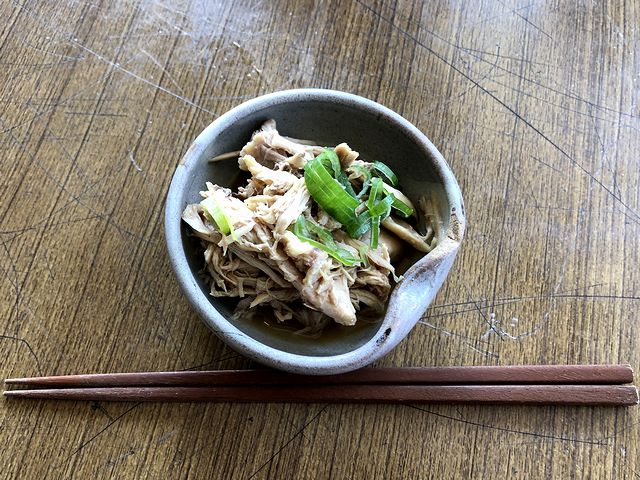 以前と同様の、内外とも洒落た印象のお店ですが、入口の位置が変わったような気も。早速入店し、今回は、明るいテラスにある席に座ることに。で、早速注文なのですが、今回は同行の家人ともども以下の品々をお願い。それらが出てくる間、出汁に使用したと思われる鶏肉がサービスで出てきたのですが、旨味の残った肉がたっぷりと付いているのが嬉しく、お味の方も掛けられたタレや薬味的白ネギと相まって、これがなかなか。