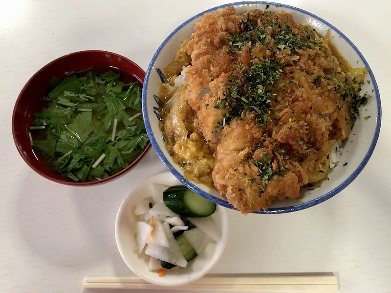 こちらは、同行者がいただいた品。「阿Qさんのカツ丼って、どんなものかしらん」と軽い気持ちで注文したようなのですが、量はともかく(阿Qさんなので)として、玉ネギの卵とじの上にカットされたカツが載り、そこに青さがたっぷりかかっているという構成にちょっとびっくり。それに興味をそそられ、自らの腹具合も顧みず味見させてもらったところ、玉ネギの卵とじは味が濃くしっかりと甘味が聞かされ、その上に乗るカツは、衣サクサクで肉柔らか。そこに青のりの風味が強く効かされており、味的には良いにもかかわらず、同行者が言うところの「カツ丼食べている筈が、何を食べているのかわからなくなってくる。」に激しく同意しました。