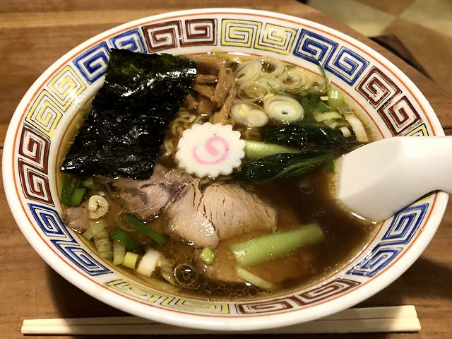 こちらは、同行の家人がいただいた品。細縮れ麺に、具材はチャーシュー、メンマ、ナルト、青菜、海苔とものすごくオーソドックスというか、いかにもな「中華そば」という見た目なのですが、例によって少々味見させて貰ったところ、若干濁りのあるスープは見た目以上に力強い旨味に溢れ、そこに細縮れ麺が絡んでこれも、また。しかしながら、ただのレトロ趣味ではない今風な味わいとオリジナリティーがあって、これはじっくりと1杯いただきたい品ですね。