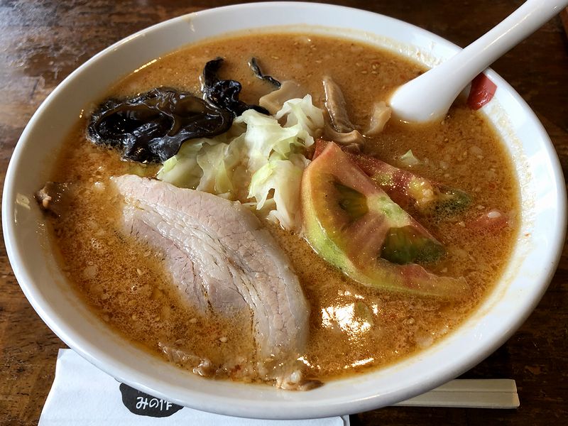 で、目の前に置かれてまず気がつくのは、食欲をそそろニンニクの香り。その香りに誘われて早速スープから言ってみたところ、トロミのないサラッとした口当たりで、なんと味付けは味噌ベース!酸味はキツくなく、辛味はチョイ辛~ピリ辛程度でしょうか。(辛味については感じ方の個人差が大きいですが。)そして細麺をチョイスした麺は他のラーメンと共通でしょうか?細麺と言っても極端に細くなく、食べ始めは硬質なバツっとした歯応えのものが、食べ進むうちにだんだんやわくというか、馴染むように変化していきます。それと具は、生のトマトと茹でキャベツ、チャーシューなど一般的酸辣湯麺には入っていないであろう品々ですが、このラーメンとは良く合っていて。そんなわけで、「みの作流」が相当効いた酸辣湯麺というか、正直な感想としてニンニク効いてすっぱ辛い味噌ラーメンだと思ったのですが、それと同時に、よくまとまった一杯だとも思いました。