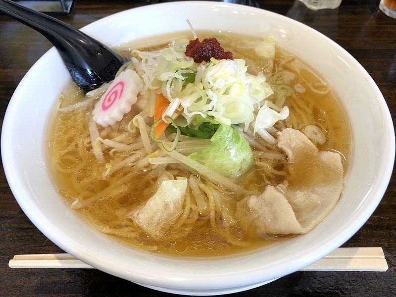 で、注文からちょっとだけ待ってから登場した栃木タンメン。早速スープからいってみたところ、まずはゴマ油っぽい良い香りが。またスープは黄金色ですが、それはスープ自体の色らしく味付けは塩ベース。野菜は炒めるのではなくスープで煮て調理するタイプらしく、全体的にはあっさりとした味わいですね。ただし、スープ表面の油は多めで、それによるコッテリ感もちょっとあるというか。そして麺は、硬質な口当たりの細いタイプ。それと具はタンメンなので野菜と豚肉なのですが、野菜の煮具合はシャキっとした食感を残したもの。標準だと写真のとおりの量ですが、150円プラスで野菜増しにすることもできるようです。あと天辺に乗っている赤い物体は、油感のある豆板醤のようなもので、途中で味変のためにスープに溶いたところ、豆板醤つぽい香りが強く出ました。