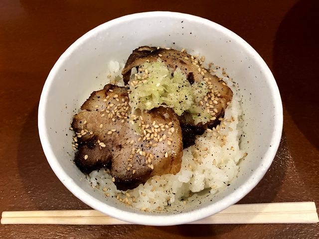こちらは、つい一緒に食券を買ってしまった品。しっかりと炙られたチャーシューの上に載っているネギダレが素晴らしかったというかゴマと白ネギの香りが良く、これはお腹が少々キツくなったとしても、いただいてよかったなぁ、と。