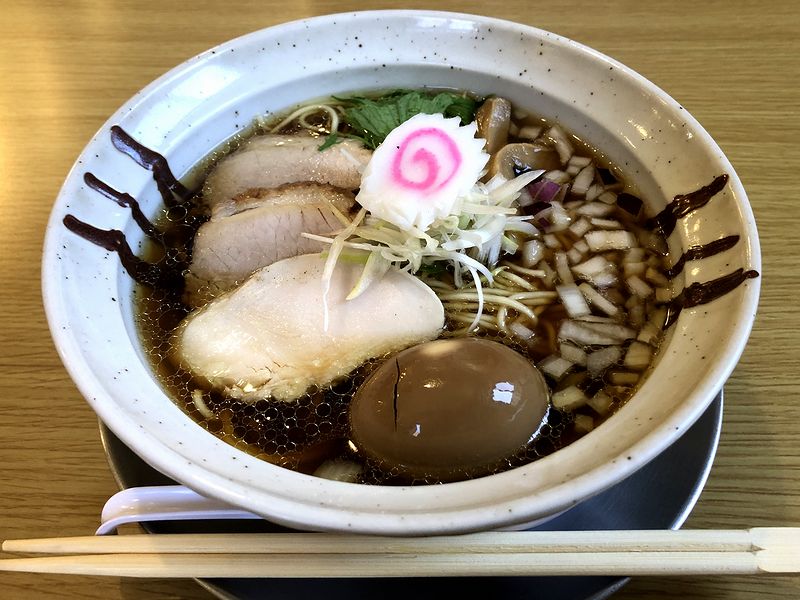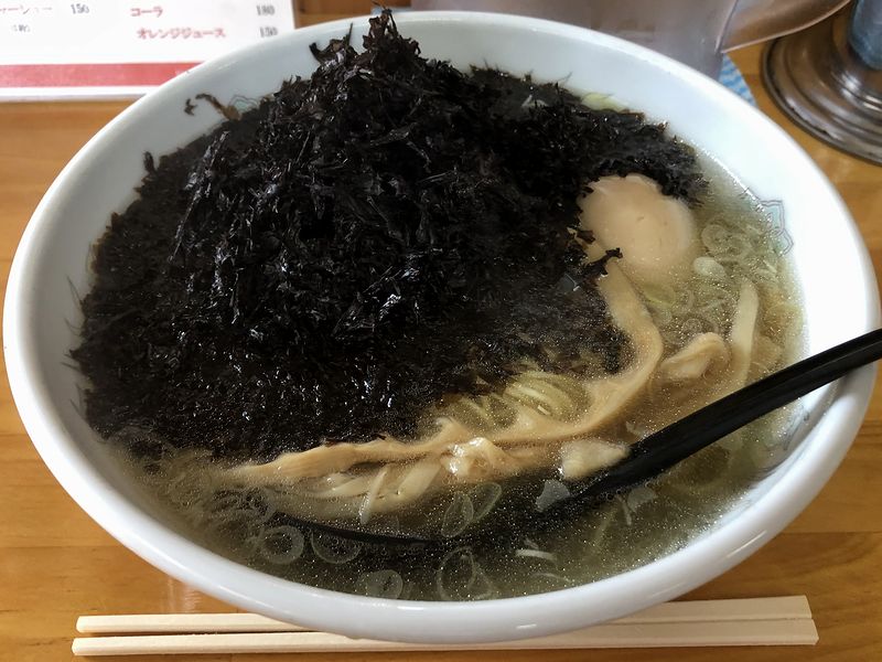 待つこと少々でご対面した今回のラーメンは、券売機のボタンに「昼限定」というテプラが張られていたこちらの品。作っている最中にした美味しそうな香りは、このたっぷりと載った黒ばら海苔の香りだったんですね。で、まずは海苔が載っていない部分のスープをレンゲですくっていってみたところ、出汁は鶏ガラと煮干しとのことですが、どちらかが声高に主張するのではなく、何ともバランスの良い味わい。更に、お品書きに「昆布粉末入り」と書いてあったのですが、その昆布の旨味でしょうか、全体にまろみがあって、これが、もう!塩ダレの味加減も程良いですね。またそこに合わせる麺は、かなり細めのストレートタイプ。加水率は低めでしょうか、最初はコリっとした歯応えで、それが徐々に馴染んでいく感じが。そして具は、Ω状に巻かれた厚めのチャーシューに穂先メンマとも味付けは控えめで、素材の味がわかるのと同時に、この塩味のスープを邪魔しない加減が何とも。あと追加した味付け卵は、黄身ががトロっとした仕上がり。ブランド卵の那須御用卵を使っているだけあって卵の味が濃く、こちらも強くない味付けがそれを引き立てていました。それで途中から、上に載っていたばら海苔を全体に混ぜ込めば、一気に磯の香りがアップして、これもまた良いですねぇ。