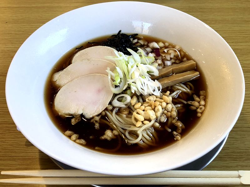 それで今回は、黒板メニューの中からこちらの品をお願い。で、登場して早速、冷たいスープを一口啜ったら、濃口醤油とともにグッと迫って来る節系の風味というか、甘さ控えめ、味濃い目の、しっかりしたそばつゆ然とした味わいにちょっとびっくり。注文する際、冷やしラーメン的なものを勝手に想像していたのですが、実の所は個人的にも以前いただいたことがあった山形県天童市発祥の「鳥中華」の冷やしバージョンといった感じの品だったんですね。そう言えば、揚げ玉や海苔など、見た目からして鳥中華っぽかったじゃないですか。(そこで気付こうよ、オレ。)そして麺は、鳥中華よろしくやや細めの中華麺なのですが、冷たく締められたことによってコシが増し、具の鶏チャーシューはしっとりとした食感と程よい味付けがいい感じ。あと、オリジナルの鳥中華にはなかった生タマネギが、食感と味の両方で良いアクセントになっていました。