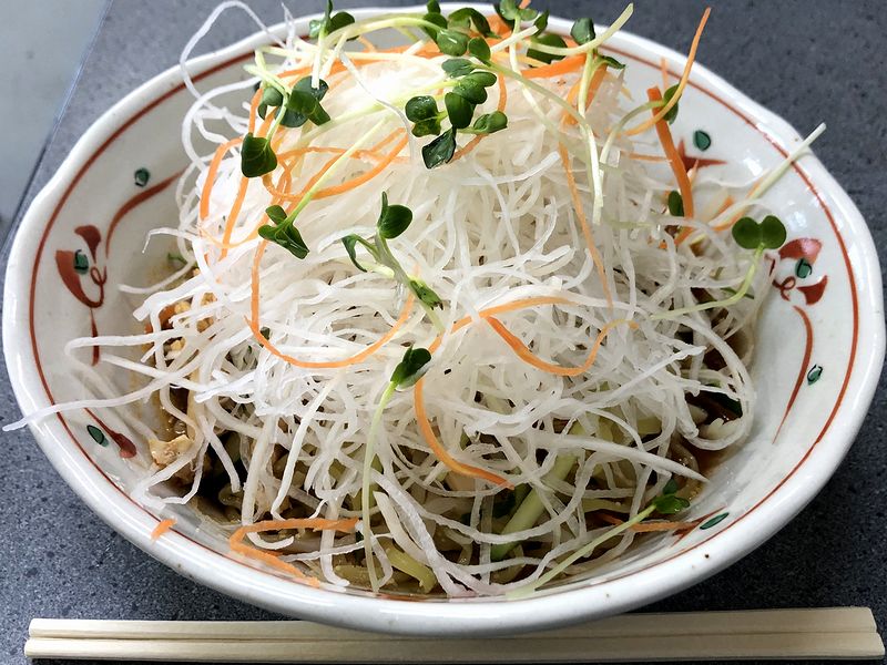 なのでお願いしたのは折角なのでその四川の方。以前いただいた四川ラーメンは笹切りのネギなどがこんもりと載っていたのですが、四川冷やし中華は千切りの大根などがそれよりもこんもりと載っていました。またその下には、国産鶏肉使用という酒蒸し鶏と千切りのキュウリが。更にその下には、こちらのお店のラーメンと共通でしょうか?平べったい中太の縮れ麺という案配。それで今回はあえて混ぜずに麺を引っ張り出して啜ってみたところ、冷たく締められたことによって麺の食感と喉越しが強化されているのはわかるのですが、それよりも特徴的なのが辛味の効いたタレ。甘酸っぱい醤油味をベースに、その辛味の元は唐辛子というか豆板醤っぽい味がしたように感じたのですが自信なし。あと、すりゴマも入っているんですかね?それらが、しっかりと個性は出しつつもバランス良くまとまっていて、これが、もう。そしてつぎに、全体を絡めていってみたところ、シャキシャキの大根にタレが良く絡んで、更にそれが麺と一緒に口に入ると食感的にも良く、これも、また。それと具の、貝割れ大根のピリっとした辛味もアクセントとして良く、鶏の酒蒸しはしっとりジューシー。あとキュウリもちゃんと味の一つを構成している感がありました。