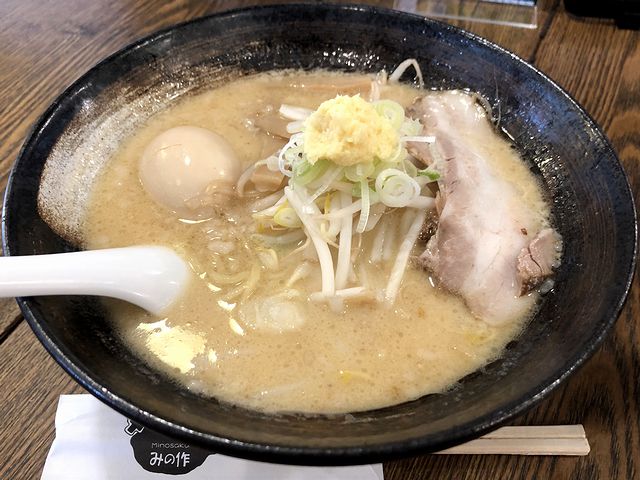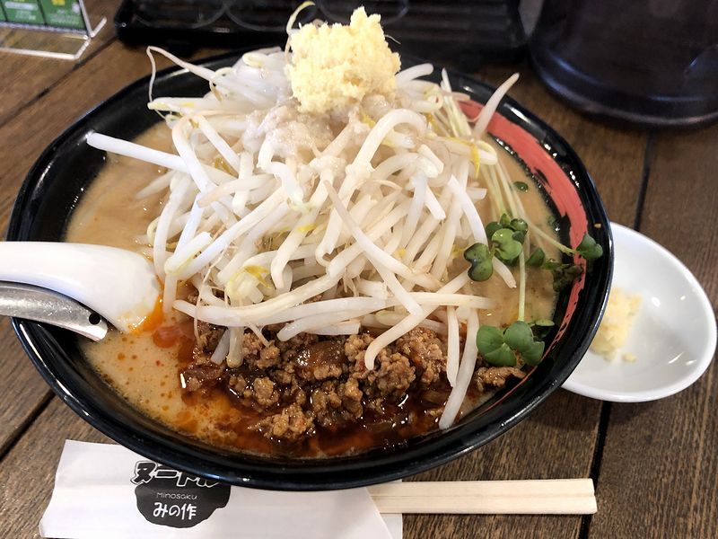 それがこの、みの作流酒粕味噌らーめん。注文時、具のモヤシを増やせるがどうするか尋ねられたので、増していただくようお願いしたところ、山のように盛られたモヤシに軽く驚きました。で、早速スープからいってみたところ、酒粕が程よく主張してこれがなかなか。白味噌と酒粕の相性が良いのは知っていたのですが、それだけではないまろやかなコクや甘味のある味付けと、更にはベースのスープが加わることによって、ラーメンを食べられる汁の味になっていますね。モチシコっとした食感の、太めの縮れ麺が良く合います。それと具は、味変アイテムを兼ねるピリ辛なひき肉が面白く、途中から良く混ぜると、よりハッキリとした味に変化。味変アイテムと言えば、天辺に載ったおろしショウガも相性が良く、味にサッパリ感を加えてくれますし、別皿で添えられるニンニクは、パンチの有るジャンキーな方向へと変化させてくれました。(個人的には、ニンニクは少々勿体無い感が。)あとベースのスープというか味が重めなので、シャッキリしてサッパリしたモヤシとの相性も良かったのです。