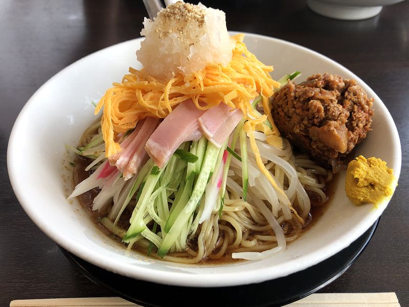 それでその気になるメニューというのが、個人的に、夏に食べたくなるアレこと冷し中華。こちらのお店のは、大根おろしが載っているのが特徴的ですが、POPにはトッピングとして大根おろしの追加のほか辛ひき肉が載っていたので今回は辛ひき肉を追加でいってみることに。