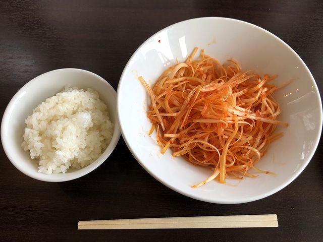 この日は平日だったので、注文時、ランチタイムサービスのミニごはんを付けるか尋ねられた時、つい「はい」と言ってしまったという。で、個人的に冷し中華を白米のおかずに出来るほど強者ではないのですが、そんな時に役に立ったのが、冷し中華の味変用にお願いした、店頭においてあるガチャガチャの4等景品である辛ネギ。これが量的にたっぷりあったのと、おかず的能力も高かったため、ご飯を美味しくいただくことが出来ました。