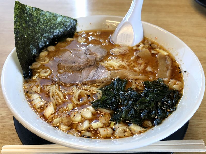 まずはスープからいってみたところ、こちらのベースとなる結構コッテリ目の豚骨スープに、味噌なのか醤油なのかは正直わからなかったしょっぱ味が気持ち強めに効かされ、更にそこに、どちらもしっかりと主張するけどやりすぎない程度の七味とお酢が加わって、更には、たっぷり入った薬味の白ネギも風味をアシストして、これが、もう。一口飲んで、思わず私なんかよりも味にうるさい同行の家人にも味見させたら「これは美味しい。」と言っていたのですが、ほんと、個性はハッキリしているけどグッドバランスな味わいですね。またそれに合わせるのは、若干やわめの自家製ラーショ麺。このたおやかな食感は、このスープでも難なく合わせてしまうんですね。そして具は、柔らかいチャーシューとおなじみのメンマにワカメと海苔。なかでも特にワカメは、スープにお酢が入っているせいか、とても合うように思えました。