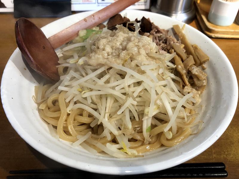 それがこの、にんにくまぜそば。こちらのお店のノーマルなまぜそばはかつて一度いただいたことがあったのですが、だからこそ、もう一つのこちらの品が気になったという。それで注文から待つこと少々で登場したのですが、麺を見てその理由が判明。というのも、濃厚つけ麺などと同じ、湯で時間が長めの極太ストレートタイプを使っているんですね。(ノーマルのまぜそばは煮干つけ麺に使われる若干細いタイプだったかと。)更に早速全体を良く混ぜようとしところ、スープが結構入っているのに気が付きました。で、こちらの品はスープのお陰かそれほど混ぜなくて良いようなので全体を軽く混ぜてから麺を啜ったところ、こちらもスープのお陰かタレの塩気や油っ気などが、直接がガツンと来ないというか。タレというかスープの味付は濃いめですし、更に背脂は載ってますし、加えて揚げニンニクも強い香りを放っていますが、味のアタックは鋭くなく、逆にマイルドな味わい。個人的には、スープパスタを連想しました。あとは、ひたすら大盛りにした麺や具を口に運びという感じなのですが、麺は歯応え、コシ共にとても強く、更に具の茹で野菜も食べ応えがあるため、食べ終わる頃には相当満腹に。それにしても、こちらのノーマルなまぜそばとは全く印象が異なる一品でしたね。