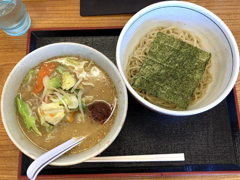 それで今回いただいたのがこちらの品。実は注文する際「辛しみそ野菜ラーメンはわりと食べるけど、つけめんは食べたこと無いよな」などと思ったのですが、このブログの過去記事見ると、平成24年に食べていたじゃありませんか。と、軽くショックを受けつつ、その時と同様に、はじめはレンゲの辛しみそを溶かずにみそ野菜つけめんとしていただけば、これがなかなか。以前はひたすら丸い印象だった味わいが、つけ麺でもしっかりと味が乗ってくるように感じます。それは、辛しみそを溶くと更に顕著で、辛味はピリ辛程度とはいえ味も濃くなって、更にグイグイと迫ってくるというか。あとは、具の豚肉やたっぷりの野菜もいただきつつ麺を啜り、途中から味変でお酢を麺かけて。この方が、お酢の量が少量で済むのですが、今回はつけ汁の味わいがとても濃く感じたため、気がつけば結構な量のお酢を麺にかけていました。