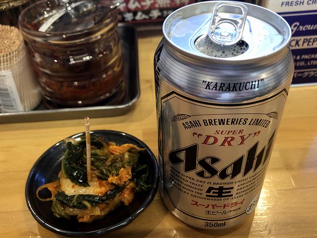 帰り道の運転は同行者にお願いしてあるので、入り口のところで食券と共に、その向かい側にある自販機で缶ビール(1人2本までとなっています。)を購入。食券提出後、無料の自家製キムチをつまみにいただけば、もう。それにしても、アサヒスーパードライは裏切りませんなぁ。