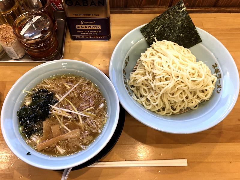 それで今回いただ いたメインの品が、看板商品というか、「ラーメンョップ」の看板にネギラーメンと共に書かれているこちらの品。ちなみに、麺は並盛(約435g)も中盛(約580g)も大盛(約725g)も同一料金なのですが、今回は並盛(それでもラーメン1.5玉分)でお願いしました。で、早速つけ汁に麺を浸してズルズルっと啜り込めば、これがなかなか。自家製の麺は、茹でたあと締められたことによってお品書きに謳ってあるとおりのツルシコ食感となっています。またつけ汁ですが、醤油ダレがしょっぱめに効き、そこにお酢の酸味や背脂のコッテリ感は足されていますが甘味はなし。そこにネギを和えているゴマ油の香りが加わっていて、良い感じですね。更に、卓上のラージャン、ニンニクで味変しつついただけば、また。