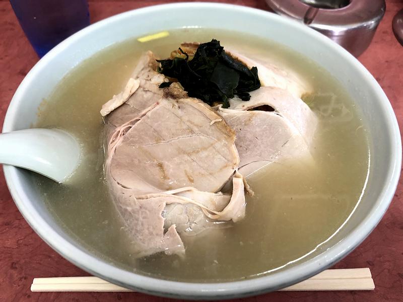 こちらは、同行者がいただいた品。つけ麺と餃子でお腹がいっぱいになってしまったので、スープを少々味見するに留まったのですが、ネギが入らないせいか背油の香りがして、口当たりはかなりコッテリ目に感じました。
