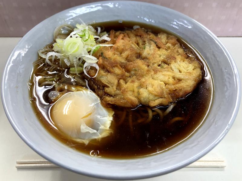 そんな中からディスプレイにタッチするイマドキの券売機で食券を購入したのは、個人的定番のこちらの品。素早い調理で手渡されたのですが、早速、色が黒ぐろとした(ただ、写真は実物より更に黒っぽい色になってしまいまして……。)ツユからいってみたところ、出汁感はそれなりにあり、さらに甘味が効いた優しめの口当たりなのですが、塩気もしっかり濃い、生卵にも負けない個人的にかなり好みのタイプですね。またソバは茹で麺で、太さは中くらい。プリっとした歯ざわりでした。そしてかき揚げは、サクっやフワっ、カリっというよりも、若干シナモサっとした食感ですが、ツユとの馴染みは良いですね。