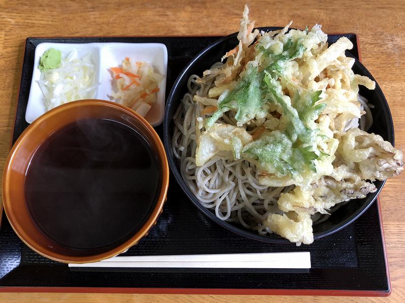 それでいただいたのが、数年前もいただいたこちらの品。早速、細めで瑞々しい感じがするソバにワサビを付け、温かいツユ浸けていってみと、そのツユから生醤油っぽいアタックの鋭さを感じます。(生返しか半生返しかは判らなかったのですが。)また甘さは控えめで、全体的な味の濃さは、個人的には丁度良いかと。そしてソバは、蕎香ビンビンって程じゃないですが、歯応え、喉越し共に良いですね。それとそしてソバの上に載るかき揚げは、タマネギ、ニンジン、春菊、笹がきのゴボウと野菜オンリーというところが当地っぽくて良い感じ。そしてもう一つ載っている舞茸天と共に、どちらも揚げたてサっクサクです。あとは、かき揚げや舞茸天をツユに浸したり、それらと一緒に蕎麦を啜ったりして楽しみつつ、最後は、茹で汁そのままよりは若干濃いめに感じたそば湯でフィニッシュ。こちらの大盛りは(バカ盛りではないもののの)そこそこ量が有ると思うのですが、天ぷらを含め食べた感じが軽いので、ほんと、さらっと完食できてしまうというか。