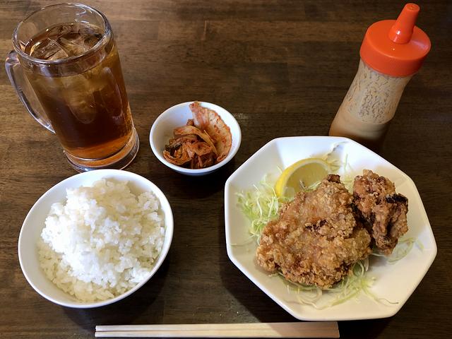 こちらは、一緒にいただいた品。大きな唐揚げは、衣がカリっと中ジューシーでそのままでも旨いのですが、付属のタレを掛けても。そういえばこのタレ、これまでそう意識させられることはなかったのですが、マヨネーズが結構効いていたんですね。