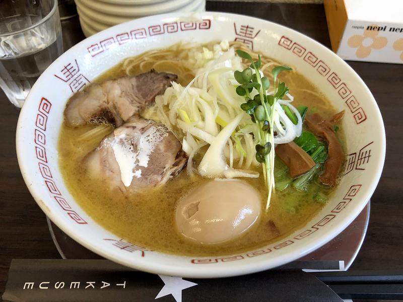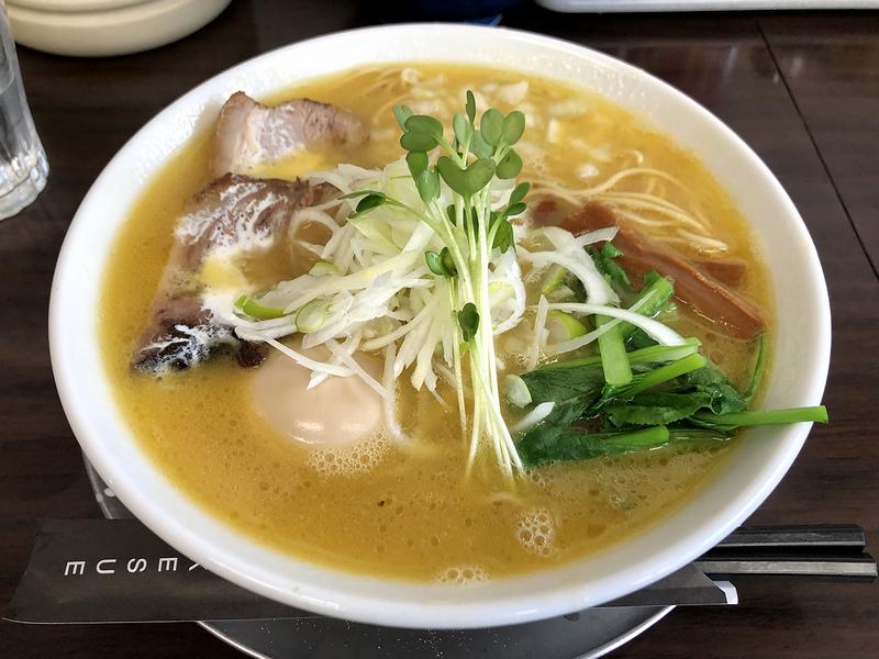 それでこの日いただいたのは、個人的にこちらのお店を代表する品だと勝手に思っている「二代目」を、味玉入りで。登場して早速スープから行ってみたところ、濃厚かつクリーミーだけど強調したようなドロドロ感のない、ほんと良い具合の鶏白湯は健在。味加減もばっちりですね。また麺は、低加水タイプのかなり細めのもの。最初はやや固めの食感ですが、低加水タイプゆえそれが急速に馴染んでいくというか。そしてチャーシューは、肉の食感を保ちつつ柔らかな、個人的に大好きなタイプ。細目のメンマは、色は濃いけど味はそれほど濃くないというか、ちょっと捻った味がします。加えて、青菜、カイワレ、白ネギ、生タマネギといった具のバランスが良いですよね。それと追加の味玉は、黄身の中心部がトロトロで、全体的にしっかり目の味付け。それにしても、卵自体の味も濃い、良い卵ですね。