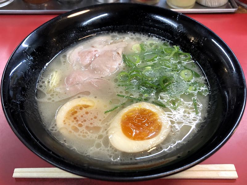それで注文から程なくして登場したラーメン。早速スープからいってみたところ、白湯豚骨でも博多のラーメンらしく、濃厚というよりはサラッと感がある口当たり。そこに油とニンニクでパンチを出している感じでしょうか。また、当地らしい細麺はバリカタで注文したのですが、ホギっとした食感で、味も悪くないですね。そして具は、これまた博多のラーメンっぽい薄いチャーシューと青ネギ。シンプルだけど必要十分かと。それと追加の煮玉子は、醤油の風味が強めで甘味を感じる味付けが面白いですね。