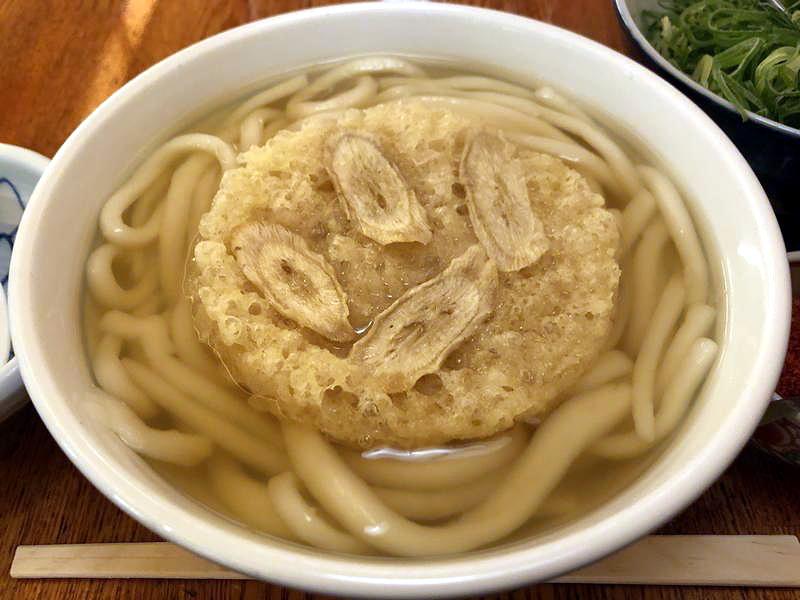 それで注文からさほど待たずに登場した因幡名物のこのうどんですが、早速ツユからいってみたところ、いりこと昆布出汁がベースだけあって鰹出汁のような華やかな香りこそないないものの、じんわりした出汁感がちゃんとあり、味加減は適度。また茹で置きというウドンは、当地のものらしく柔らかい口当たりなのですが、中心部にはコシも残っている茹で加減。そして具のごぼう天は、ほぼほぼ衣のかき揚げの中心部にゴボウのスライスが幾枚かという構成で、これはこれで悪くないというか、衣がツユに馴染んで味わいが深くなると同時に、ゴボウの歯ごたえも楽しめるように感じました。