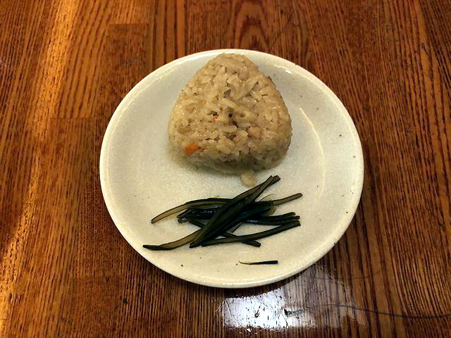 こちらは、一緒にいただいた、当地名物と言える品ですね。で、鶏などの旨味と薄目な味加減で、ほんと、サイドメニューにピッタリ。また、添えられているのは昆布の佃煮で、これも柔らかめな歯応えと濃すぎない味加減が良かったです。
