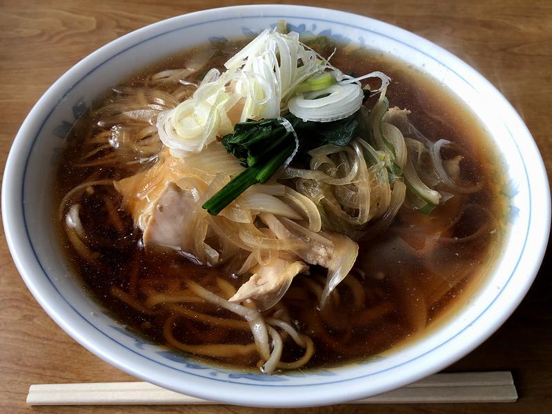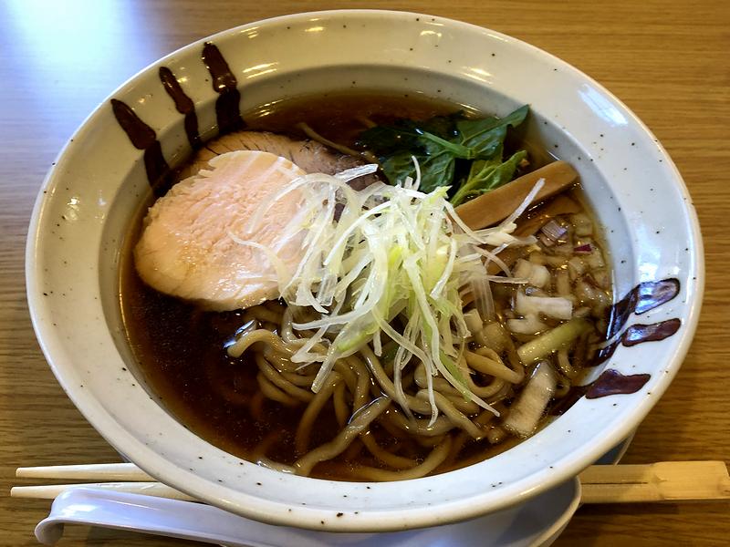 それでまずは、私がメインにいただいたこちらの品。パっと見で澄んだスープなのですが、丼に顔を近づけると、「ふんわり」というわりも「しっかり」と煮干しの食欲をそそる香りが。それに誘われるようスープを一口いってみたところ、その味も、煮干しの風味・旨味が十二分に感じられるというか、あくまでも煮干しが主役の味わいで、加えてそこに醤油味が濃い目にビシっと効かされており、これが、もう。また、それに合わせるのは中太の縮れ麺なのですが、手もみが十分になされているのか捻じれ感もありますね。で、デフォルトだと硬めの仕上がりに茹でられ、密度感のあるプリモチシコっという食感で、麺自体も凝っていることがうかがえます。そして具は、鶏と豚、2種類のチャーシューが載っているのですが、中でも鶏肉のしっとり感が印象深し。あと、タマネギと白ネギという2種類の薬味にはこだわりを感じ、太いメンマはしっかりと。あと、青みが生のホウレンソウというのが面白かったというか、これはホウレンソウが旬を迎える冬ならではなんでしょうか。