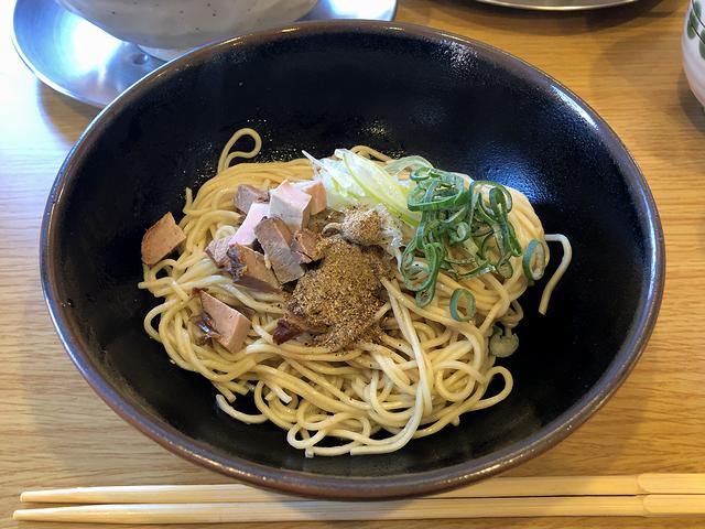 なのでもっと堪能したくなってしまい、こちらの品を注文。最近よく見かけるようになった和え玉ですが、こちらのは中細麺とタレと煮干し粉、薬味のネギに具のチャーシューといった構成でした。それで当然、あえ玉単体でも美味しくいただけるのですが、それもそこそこに、鶏白湯ら~めんのスープに浸けたり、最後は投入したりして堪能。煮干しと鶏白湯の相性も良く、これまた良かったです。