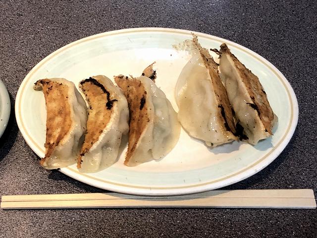 こちらは、一緒にいただいた品。っていうか、こちらのお店は元々餃子が有名だそうで、食べておかないと勿体ないかと。ちなみにこちらのお店には、焼餃子のほか、揚餃子(200円)、水餃子(300円)もありました。で、写真だと少々やる気なく盛られているのですが、何もつけずに一ついただいてみたところこの値段がちょっと信じられないちゃんとした味なのにびっくり。餡には干し貝柱も使われているそうで、特別高密度とか特別ジューシーなわけではありませんが、自家製のモチっとした皮ととてもいいコンビネーションです。