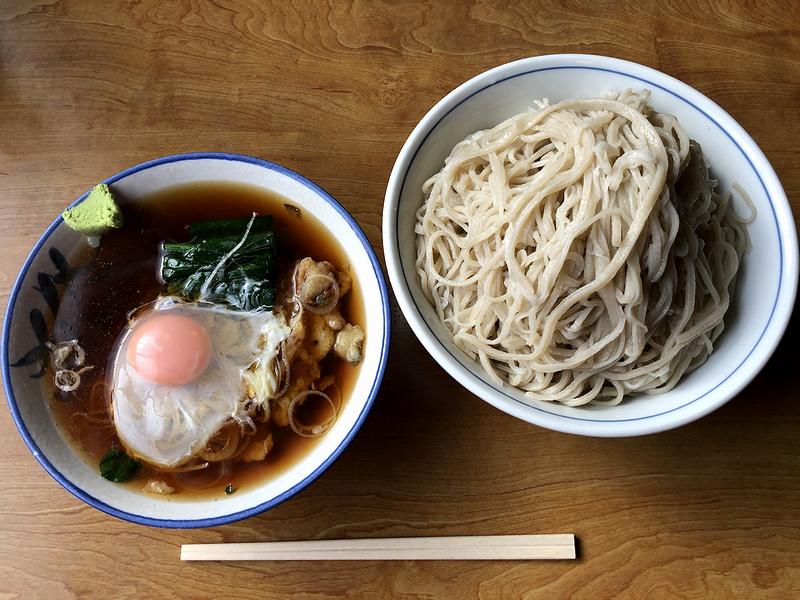 そんなわけで少々待ってから登場したのが、今回注文したこちらの品。蕎麦がいただきたい気分と言っときながら、注文時につい、うどんとのミックスにしてしまったという。それでまずは、ウドンの上に載っているソバからいただくのですが、ツユにザバと浸けて口に入れれば、出汁の香りはすれど、当地らしく醤油風味の濃さも負けないくらいある甘さ控えめなツユの味わいと相まってこれが、もう。ちなみにそのソバですが、太さはバラつきがあり、その食感も表面がザラポコっ、ツルっというよりもモチっとした食感が、何とも気取らない感じでほんとに良いです。次に、下からウドンを引っ張り出そうとするのですが、1本1本がかなりの長さ。それでも何とかツユに浸けていただけば、(ミックスを)いただくのは2度目にもかかわらず、暖かいウドンにちょっとびっくり。食感はコシというよりもモチっと感が強く、また太さもかなりのもの故、1本で口いっぱいになり、それをワシワシといただくような食べ方になります。それとあらかじめツユに入ったかき揚げは、柔らかくツユと馴染むけど、衣は最後までツユに溶けないタイプ。あとはひたすらソバとウドンを口に入れ、途中から卵黄を割って味変しつついただくのですが、やっぱりウドンが入るミックスは、ソバだけの大盛よりかなり食べ応えが増す気がしますね。