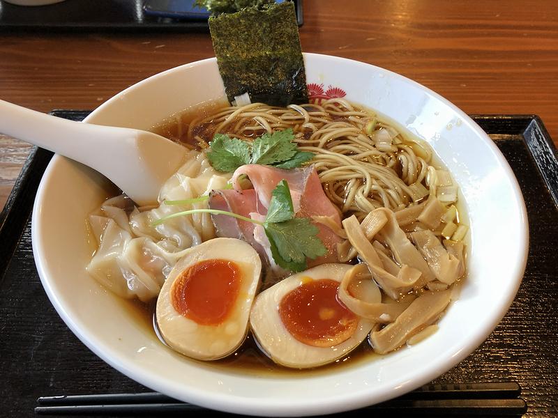 かさね醤油ソバ(細麺)半熟味玉・エビ入りワンタンのせ 1000円