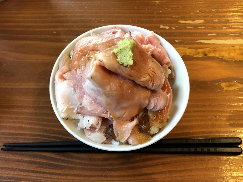 こちらは、一緒にいただいた品。写真でもわかると思うのですが、たっぷりと載る低温調理された豚肉の肉感が素晴らしいですね。個人的に、冷たい肉に温かいご飯の組み合わせは少々苦手なのですが、これはそれを吹き飛ばす旨さ。あとタマネギ入り?醤油ベースのタレとワサビがとても合っていました。