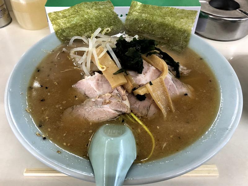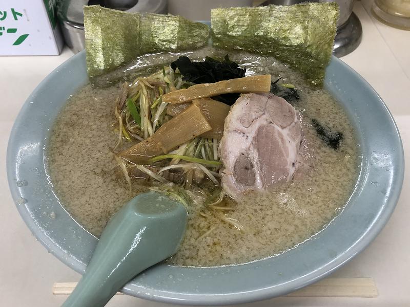 注文の際、ネギかネギ味噌かで一瞬悩んだのち、ネギに決定。調理しているところを見ると、平ザルで背脂がゴリゴリされていたのですが、目の前に丼が置かれると、確かにスープ表面が、たっぷりの背脂で白くなっていますね。それでまずは全体をよく混ぜてから、レンゲでスープを一口いってみたところ、背脂のお陰で口当たりが甘いです。また、確かにコッテリはしていますが、決して脂でギッタンギッタンという感じではなく、加えて元の豚骨スープのまろやかさとコクが、背脂によって分厚くなっているという感じで、これは旨いですね。他は、若干やわ目のラーショ麺に、ホロトロのチャーシュー、そして、ピリッとした刺激とゴマ油的良い香りを纏ったネギ、大ぶりだけど柔らかいメンマ、ラーショのお約束であるワカメ、溶けやすい海苔と、いつもの鹿沼インター北口店さんクオリティというか。それを、最初はそのまま、次におろしニンニク投入、そして豆板醤はレンゲにとって麺に付けていただき、終盤にお酢、最後に紅生姜を投入してフィニッシュ。