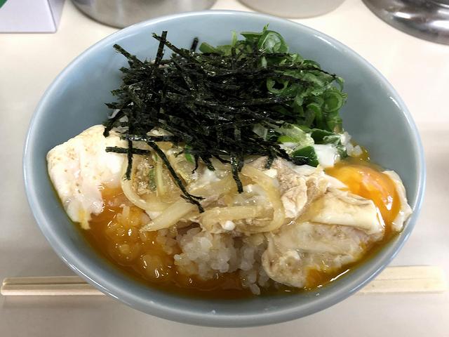 こちらは、一緒にいただいた品で、卵とネギをタレでさっと煮たものを、ネギと海苔と共にご飯に載せたもの。今回のは黄身が破れてしまっていますが、どうせいただく時に潰しちゃうので問題なし。それにしても、ラーメンと一緒に食べてもくどくなりすぎないタレの味加減が良いですね。もっとも、ラーメン+この品だと、私の場合確実に食べ過ぎになってしまうのですが、それでも今回はいただきたかったというか。