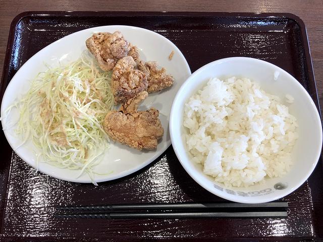 そんな中今回いただいたのが、こちらのセット。最初はどノーマルなラーメンとライスくらいにしておこうと思ったのですが、こちらでカレーライスいただく時の個人的標準が3辛だし、かなりの空腹でメニュー写真の唐揚げにそそられてしまったもので。