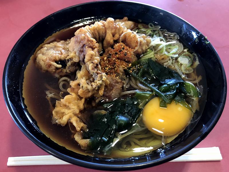 で、今回はこれまでこちらでいただいたことが無かったげそ天そばに生玉子を入れて。早速ツユからいってみたところ、出汁感は控え目。また味付けは、ほんの少し甘味が効いている気がします。そしてソバは、色が黒くて細めの茹で麺。チュルふわっとした食感で、コシや歯応え云々と言うより、勝負の合間にガバと喰える系だと思いました。そして具のげそ天は、歯応えが結構手強いという事もあるのですが、サイズ的にもかなり食べ応えがありました。