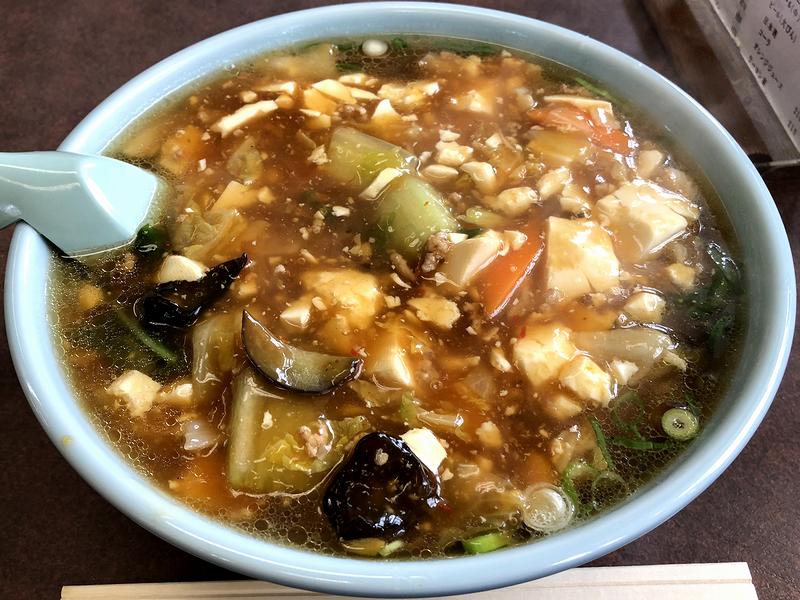 注文から、待つ事少々で登場したその白龍メン。丼の表面を覆う餡かけには豆腐の白さが目立つのですが、まずはその餡とあまり混ざらないようスープをすくっていただけば、「中華料理店の清湯スープ」といった趣のある味わい。そして次に、トロミの付いた餡かけ部分をいただいたところ、ゴマ油の香りが良く、醤油ベースの味付けはしっかり濃いめ。それとピリ辛は風味から豆板醤由来でしょうか?唐辛子なのは間違いないとは思うのですが。また、餡かけに入っている具材は、先述の豆腐の他、ひき肉と、キクラゲ、チンゲンサイ、キャベツ、ニンジンなどの野菜類なのですが、その中でもナスが珍しく感じました。で、埋蔵された細縮れ麺を啜れば、これらスープと餡を纏って口の中に入り、これがもう。時折具をつまみながらズルズルハフハフと啜れば、トロミと辛味のせいか、身体かポカポカと。あと途中からお酢を少量垂らしてみたところ、これも合いますね。それと量的にもたっぷり有り、一杯で満足する事が出来ました。