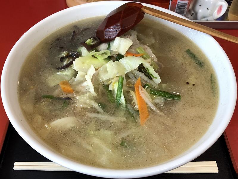 それで味噌ラーメンも気になったのですが、今回はタンメンをいただくことに。登場して早速スープからいってみたところ、最初から効いているコショウが香り、口に入れると、ベースのスープ+炒めた野菜と豚肉から出た旨味が合わさって、これが、もう。ちなみに野菜は、キャベツ、モヤシ、ニンジン、キクラゲ、そしてニラが確認できました。また味付けの塩はしっかり目に効かされ、それによって味が決まっていますね。そこに合わせる麺は、中くらい太さの縮れ麺。特に凝ったものではありませんが、逆にこのタンメンには良く合っているように思えます。