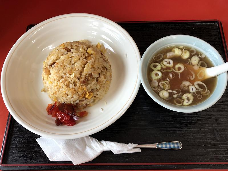 それで入店したところ、適度に経年した感じがある=この地で何年も営業されている感じがある店内は、カウンター席、テーブル席の他、小上がり(座敷)が当地らしい感じがします。そしてお品書きを見ると、中華料理店の基本的メニューに加え、名前からしてお店オリジナルっぽい品もいくつか。同行者によると、おすすめのメニューは「肉糸(ルースー)みそ」というラーメンで、確かに、この時店内にいたお客さんも、それを頼んでいた人が多かったように思えます。ですがいただいたのは、こちらのお店の名前を冠した白龍メンという品。注文の際、店員さんにどんな品か訊いたところ、ピリ辛の餡がかかった醤油味のラーメンとのことでした。