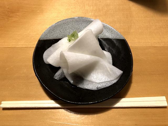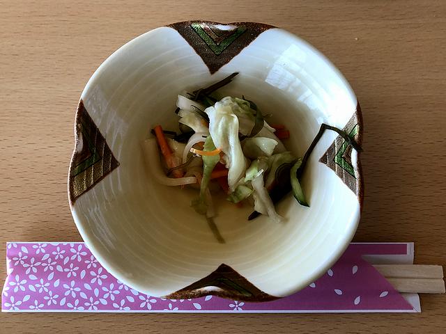 席についてまず、サービスのお新香が登場。塩加減は程良く、使われている野菜がキャベツ、ニンジン、大根、キュウリ、昆布にミョウガと、種類が多いですね。