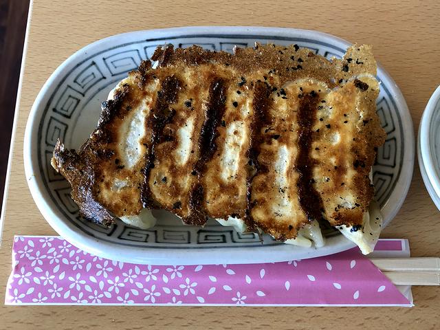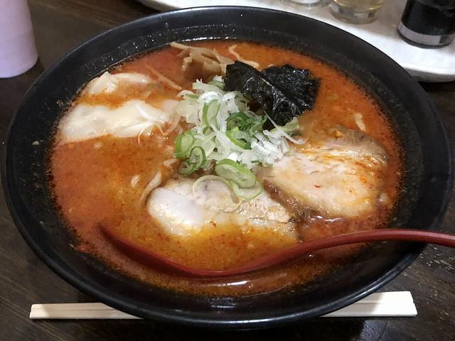 注文の時、勢い余って餃子ランチにしてしまったのですが、ランチに付く素ラーメンはこってり味のピリ辛味噌に。これまでこちらのお店でピリ辛味噌をいただく際、いつも(今で言う)「野菜」にしていたので、素ラーメンでピリ辛味噌を味わうのは今回初めてだったりして。で、早速、固形分が入る故モッタリとした口当たりのスープからいってみたところ、コクがあって背脂のコッテリ感・まろやかさは有るのですが、慣れ親しんだ野菜が無いせいか、はたまた体調のせいか、今回のは味が濃く感じます。それといつもよりショウガが効いてるようにも感じたのですが、こっちのほうは自信なし。(気のせいかも。)また全粒粉を使っている麺は、チュルモチっとした口当たりで、若干柔らかめの食感。そして具は、手間暇かけた感じのトロトロなチャーシューに、食感のバリエーションを生むテュルっとしたワンタンの皮が、また良いですね。