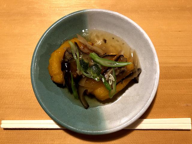 ですがその前に、サービスで出される大根の甘酢漬けと共に、最近楽しみにしている野菜メニューからこちらの品を。で、餡は出汁が効いていて良い味加減。柔らかく煮た?かぼちゃ自体も、自然な甘味が良いですね。