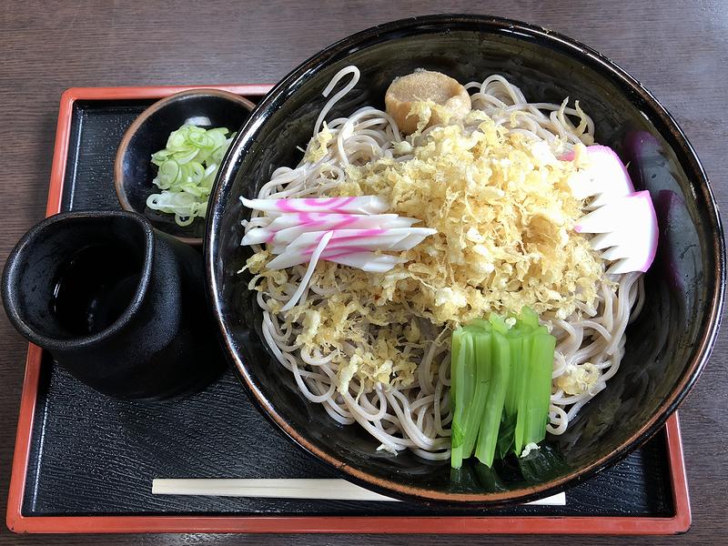 ですが、私がいただくのはこの冷したぬき。ちなみに、「冷やしたぬきそば」というそば屋の品書きも、「冷やし・ひたしそば」程ではないけどかなりローカルだと思うんですよね。(少なくとも関西には無い筈)それで注文の際、つい、100円増しの大盛にしたところ、見るからに(写真は上から撮ってしまったので判りづらいんですが)ボリューミーなものが登場して少々焦りました。で、早速トックリに入ったツユを回しかけてからいってみたところ、これまでいただいた事がある「かけ」や「もり」のツユと較べて、心なしか甘味が効いているような。気前よく乗せられた天かすの油の甘さが良く出ている為かもしれないのですが、それだけではない気もします。また、「更科」らしい白っぽいソバは、キチっと冷たく締められていて、それによりコシや歯応えがかなりのものに。そして、天かす以外の具は、カマボコとナルト、茹でた青菜の他、お麩の煮た物が珍しかったのですが、同じく珍しいと言えば、「冷やしたぬきそば」には当たり前のように載っているキュウリが無かったのもそう感じました。