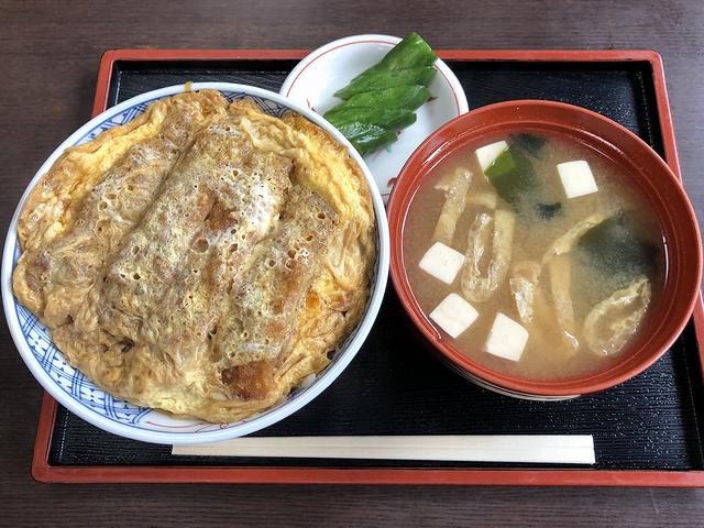 こちらは、同行の家人が悩んだ末に注文した品。それを貰っていただくのは2度目ですが、甘めで味が濃いめのツユがたっぷりと染み、間違いがないお味。大きな丼になみなみと入った味噌汁(具は油揚げとワカメ)も良いですね。