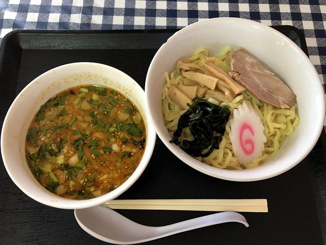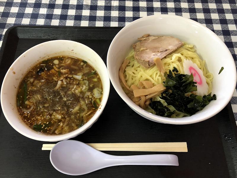 こちらは、同行の家人がいただいた品。ちなみに、こちらは期間限定ではなく通年メニューと思われます。(店内の壁上部に貼られたお品書きの中に品名の短冊あり。)で、例によって味見させてもらったのですが、以前家人がいただいたこちらの担々麺同様、ゴマは効きつつもサラっとした口当たりで甘しょっぱく感じる味付けなのですが、つけ麺アレンジとして味の濃さが増し、そこにお酢が少々入る感じでしょうか。これもちゃんと自分の物として一品いただいてみたい品ですね。