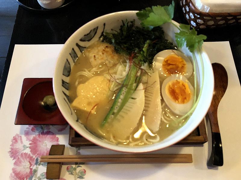 こちらが、私がメインでいただいた品。早速スープからいってみたところ、鯛白湯とでも言うべき、鯛の風味・旨味が濃厚というか、芳醇な味わいが口に広がるのですが、これが無化調で、鯛と昆布、塩しか使っていないというから驚きです。更に、無化調のラーメンにありがちな塩気を強調したような感じもなく、あくまで、素材の旨味でバランス良く味を調えたという感じがしました。また麺は、低加水?なストレートタイプで、バツっとした歯応え。こういうトロッとしたスープには、こういう麺がとても合いますね。そして具も色々と凝っていて、鯛の形をした焼きおにぎりは、その香ばしさがとても合っています。鯛の形をした黄色いのは何か判らなかったのですが、フワプリっとした食感で良いお味。あとメンマでは無くて筍を似たものでしょうか?これも味加減と食感が良く、三つ葉やアオサも風味を増す感じで使われていて、薬味のワサビも非常に合います。そんな中、味玉がスモーキーで最初はびっくりしたのですが、その香りがアクセントとなりつつも全体を壊さない感じが、何とも心憎いですね。