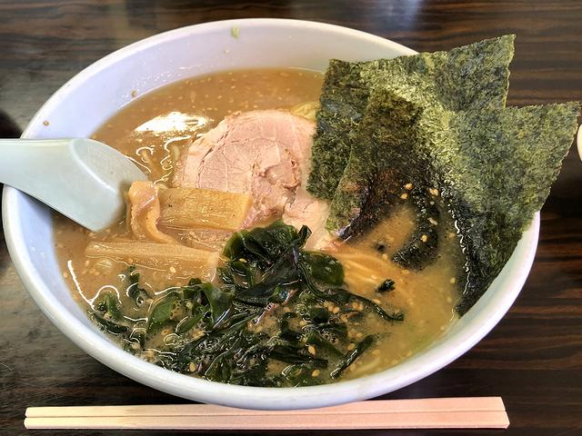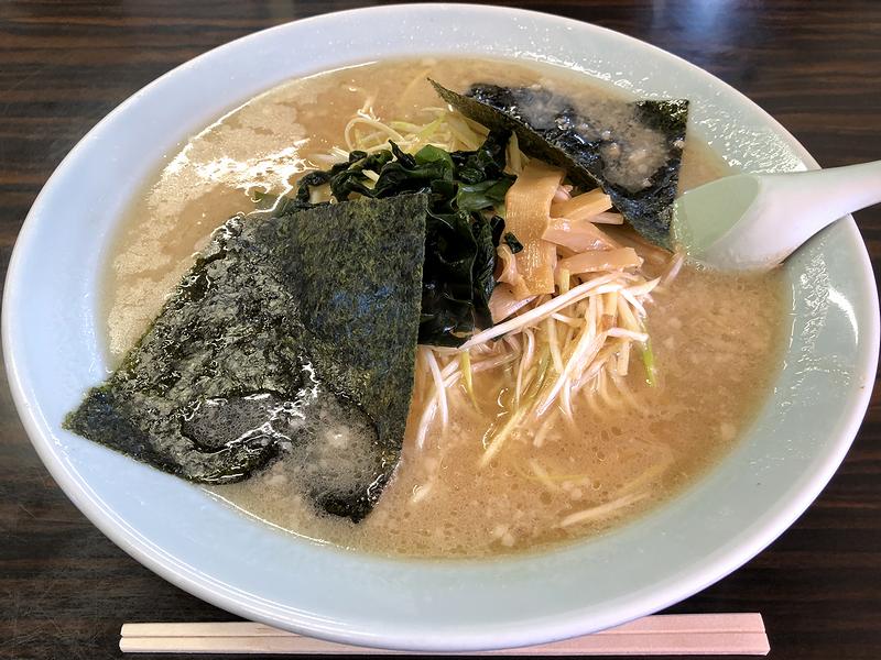 それでいただいたのは、個人的に初めてのラーメンショップでいただく事にしているネギラーメン。前述の通り空腹だったので、つい麺中盛りにしてしまったのですが、まずはそのままスープからいってみたところ、表面に背脂と細かい液体油が浮いているとおりややコッテリ目の口当たり。味わえば、豚骨のしっかりとした出汁感に、旨味もバッチリ効いています。また麺は、ゆるくウェーブがかった細めの、いわゆるラーメンショップの麺なのですが、ゆで加減は丁度良いものの、ほんの少しばかり麺が固まり気味だったのはご愛敬でしょうか。そして具は、ゴマ油が香り、タレと旨味を効かせてしっかりと味付けされた細切りのネギに加え、海苔とワカメ、メンマと標準的ラインナップ。それと別添えで出された味付けタマゴは、写真のとおりしっとりとした黄身の固まり具合、そして味加減も丁度良かったです。