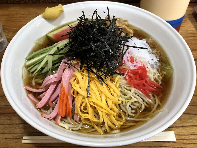 登場する時、洗面器のような器に思わず笑ってしまうほどだったのですが、目の前に置かれると、これが結構な迫力。天辺にはたっぷりと刻み海苔が載っているのが珍しく感じますね。で、海苔をひとまず端へよけてから全体を軽く混ぜ、麺をひと啜りするのですが、阿Qさん独特の細麺は、冷やされてコシがマシマシという感じで。また、たっぷりと注がれた醤油ダレはマイルドな味わいで、個人的には飲める程。ただ、物足りなさは無く、塩気や酸味、甘味、そして油由来でしょうか?香ばしい香りも相まって、何とも良い感じ。そして具は写真のとおり、ハムや錦糸卵、キュウリ、紅ショウガなどベーシックな物が揃っているのですが、それ以外にも、春雨やレタスは食感的に、先述の海苔は風味的にアクセントになっています。それと、個人的にはスイカが入っているのが嬉しいポイントです。