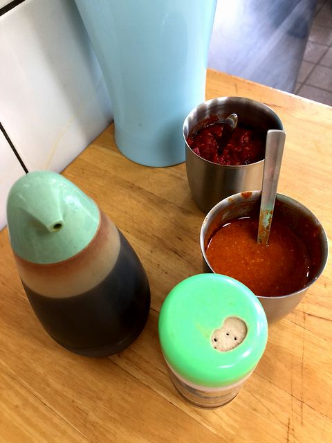 お店に着いたのは午前9時前だったのですが、店中、いや店外に置かれたテーブルを含め結構な混雑。早速店頭で注文(壁に貼ってあるお品書きを指差ししました。)を済ませると、先客のいた4人掛けテーブルで相席となりましたが、お客さんを見ていると、地元の方はもちろん、そうでない方もいるようで。(私がお伺いした時は、日本人観光客はいないようでしたが。)