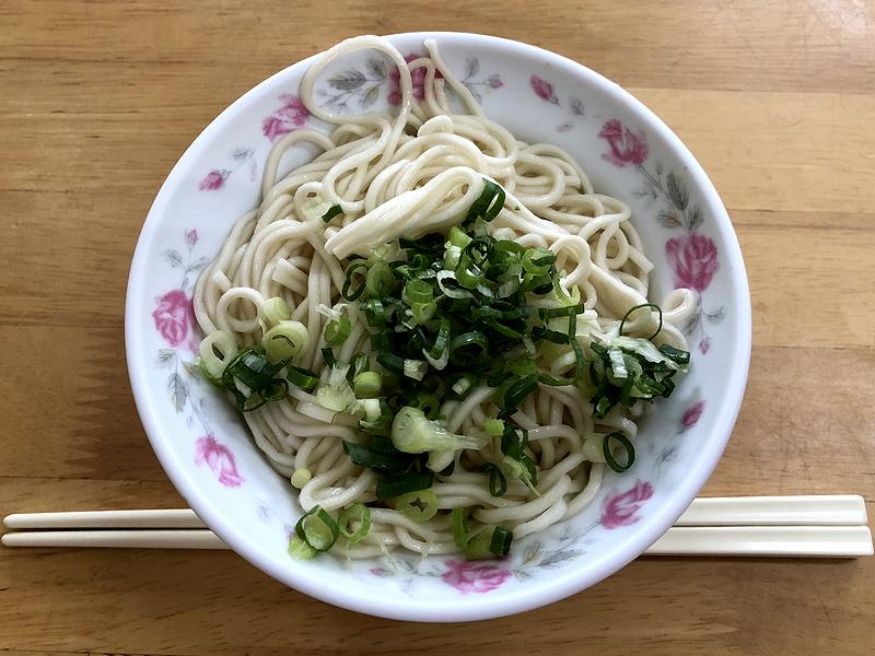 それで注文から程なくしてまず登場したのが、この乾麺(チィェンミィェン。当地ではガンミィェン?)。写真だと麺とネギしか写っていませんが、器にはタレが入っていて、混ぜてからいただきます。(もっとも、タレの色が薄いので、混ぜても見た目はさほど変わりませんが。)で、早速そのようにしていってみたところ、冷や麦より太くウドンより細いくらいの麺は、コシというよりもパツっとした歯応えがあり、それと共に小麦の味が。またタレはアッサリしているのですが、(使われている出汁に?)ほんの僅かなクセがあり、それとネギが良いアクセントになって、シンプルながらも良い感じの味わいですね。更には、卓上の烏酢(ウスターソースのような風味の黒酢。)や豆板醤的調味料を投入する事によりパンチが出て、これもまた良かったです。